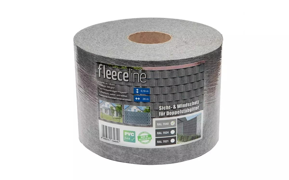 Die einfarbigen Streifen sind in einer Rolle mit einer Länge von ca. 26m und einer Höhe von 19cm erhältlich. Eine Rolle reicht für einen Standard -Doppelstabgitterzaun in einer Höhe von 2m und einer Breite von 2,50m.